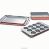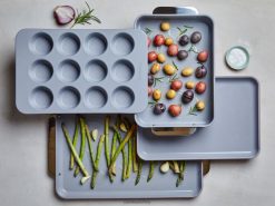 Kimyonun toksik kimyasallar içermeyen 5 parçalı seramik kaplamalı pişirme kabı seti ile tanışın. Bu sette 2 adet fırın tepsisi, bir muffin tepsisi, dikdörtgen tepsi ve dolap düzenleyicileri bulunur.