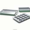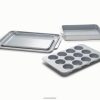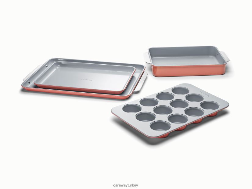 Kimyonun toksik kimyasallar içermeyen 5 parçalı seramik kaplamalı pişirme kabı seti ile tanışın. Bu sette 2 adet fırın tepsisi, bir muffin tepsisi, dikdörtgen tepsi ve dolap düzenleyicileri bulunur.