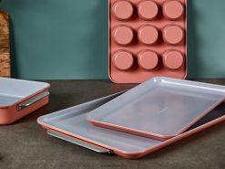 Her mutfak için temel pişirme malzemeleri, 18×13″ büyük ve 15×10″ orta boy fırın tepsilerimizin fırına hazır kombinasyonu olan fırın tepsisi ikilisiyle tanışın. Doğal olarak kaygan, toksik olmayan seramik kaplı bir iç yüzeye sahip olan bu tabakalar, sağlıklı pişirmeyi (ve temizlemeyi) her zamankinden daha kolay hale getiriyor.
